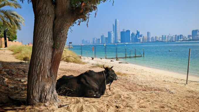Es gibt einen Moment im Heritage Village, der einem unvorbereitet trifft. Man steht zwischen Lehmhäusern, hört das Klappern eines Kupferschmieds, riecht Weihrauch aus einem kleinen Laden und sieht dahinter durch eine Lücke zwischen den Palmen die glitzernde Skyline von Abu Dhabi. Hochhäuser, Kräne, Glas und Stahl. Und hier dazwischen ein Ort, der zeigt, wie diese Stadt vor 60 Jahren aussah. Dieser Kontrast ist so scharf, dass er einem kurz die Sprache verschlägt.